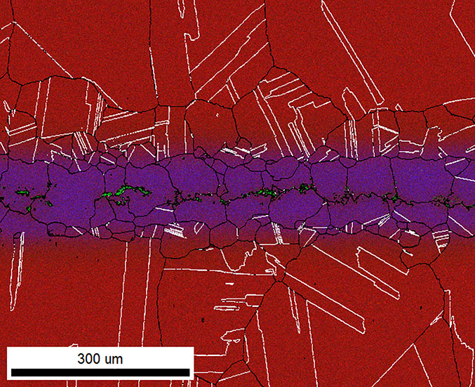 此图像显示,钎焊线水平位于图像中间,而镍合金位于视野的顶部和底部。镍合金具有明显更大的晶粒尺寸和高比例的孪晶界,而 HEA 填料具有较小的晶粒和最少的孪晶。在 Ni-HEA 界面处还存在一个带有孪晶的较小晶粒过渡区域。上述信息通常可由 EBSD 分析得到。