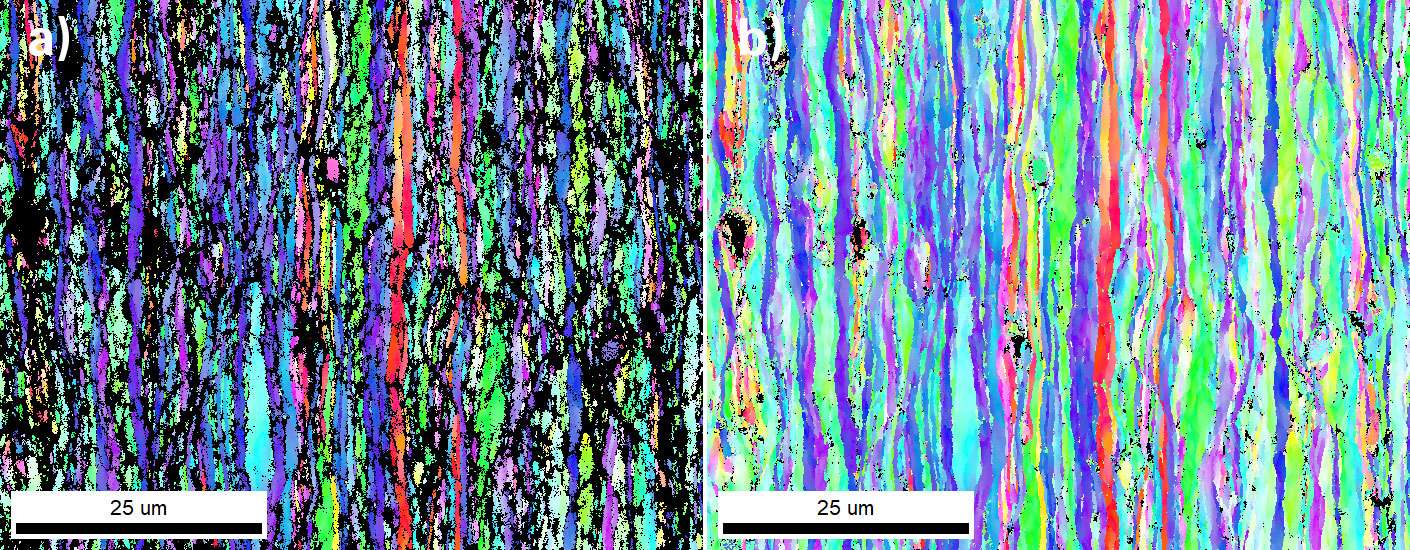 图 1. a) 在轧制铝样品中基于传统霍夫变换标定的沿着样品表面法向的 IPF 取向分布图。b) 同一样品经过球形标定分析后的 IPF 取向分布图。