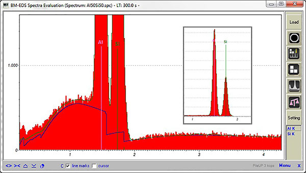 图2显示了在富铝成分样品中Si-K辐射的大量吸收效应。该效应不仅在轫致辐射计算的吸收跳跃中可见,而且两种元素的峰值高度(净计数)也有很大的不同,即便它们在样品中具有相同的浓度。